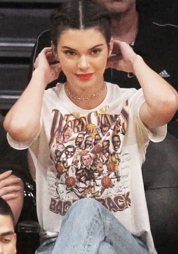 Kendall mixed her tomboy side with her girly one by pairing her Lakers Back-to-Back Champions shirt with jeans and a pair of Manolo Blahnik “Tayler” pumps.
