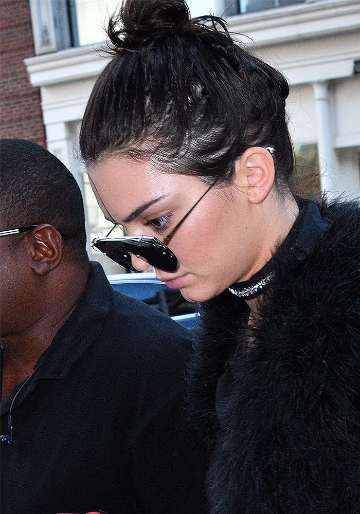 Kendall wore a Re/Done x Hanes “The 1950s” boxy tee with the Denim x Alexander Wang “Bite” shorts, all under a black fur jacket.