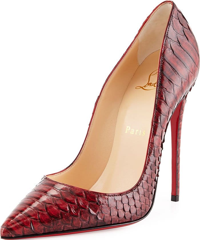 Khloe played up the sultriness of her look by slipping into a pair of Christian Louboutin “So Kate” pumps in white python leather. They have low-dipped vamps, pointed toes and about five-inch stiletto heels.
