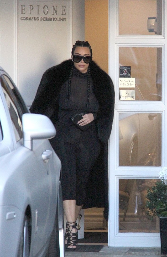 Kim Kardashian was spotted rocking her signature all-black look while leaving Epione Cosmetic Laser Center in Los Angeles on Friday.