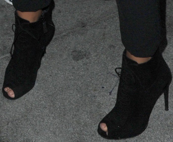 Could you see yourself in an outfit like this? Kim’s Tom Ford peep-toe booties are not available online