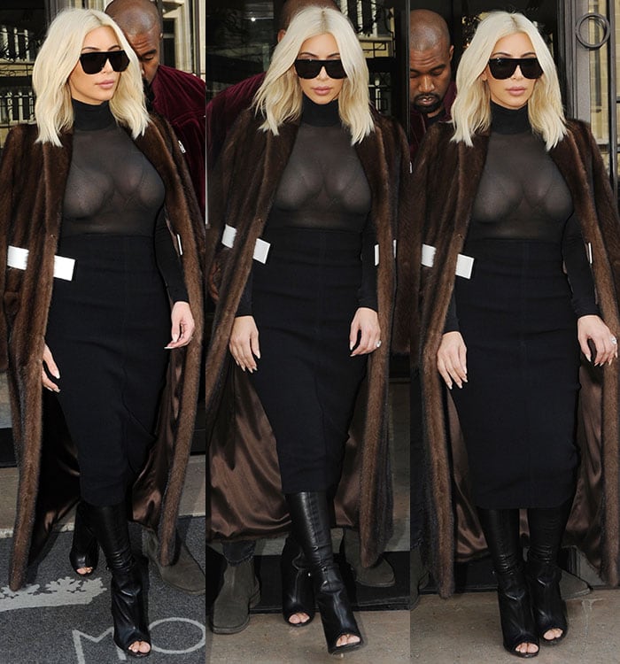 While we temporarily thought Kim—who arrived at the LV presentation in a completely covered-up outfit—might have decided to finally ditch her racy sartorial choices, just a few hours later, as she left the Le Royal Monceau hotel with her man, Kanye West, she went back to what she does best—displaying her ample assets.