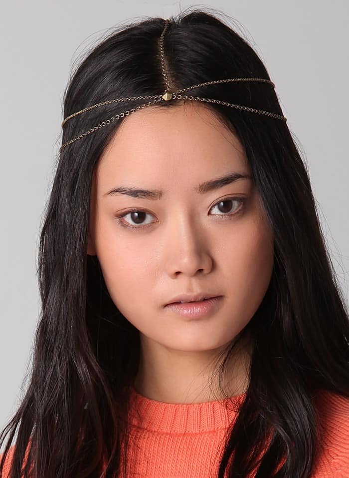 Her long dark hair contrasted with the interesting gold accent — the gypsy look always complements her facial features.