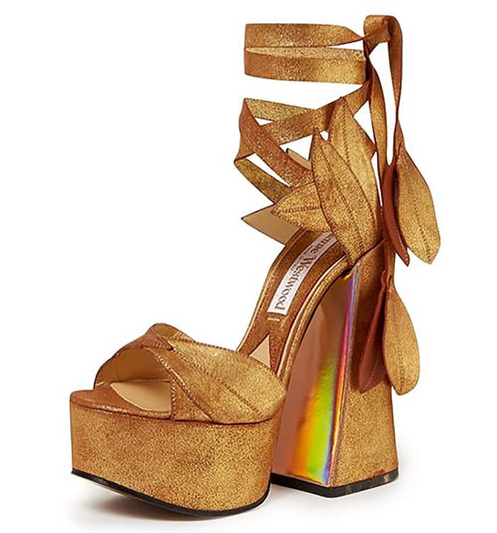 While we would’ve expected Kim to wear her usual ankle-strap sandals, she instead surprised us with chunky-heeled gold-leaf platform sandals that were much more interesting.