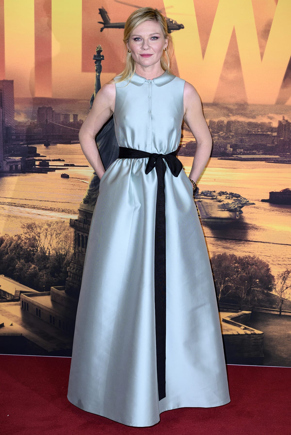 The press tour for the dystopian action film Civil War is underway. Kirsten Dunst, who plays renowned war photojournalist Lee in the movie, kicked off the promotional activities on Tuesday by attending the Civil War special screening in London dressed in a modest mint green coquette-style gown.