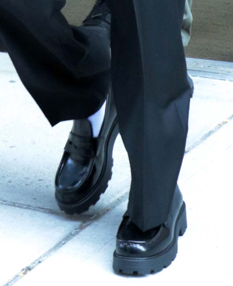 Carrying a $395 Advene Edge black leather bag over her shoulder, Kendall rounded out her street-chic outfit with white socks and Vagabond Shoemakers’ “Cosmo” loafers.
