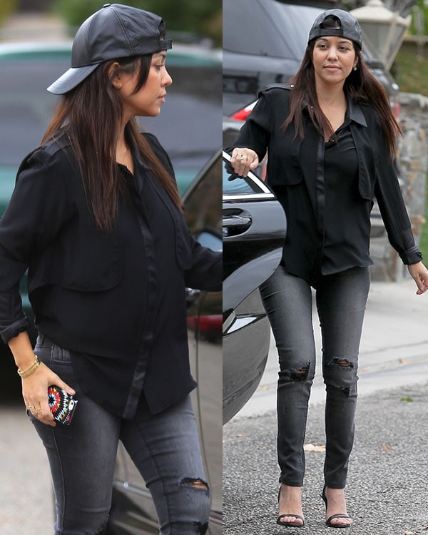 The reality star paired a loose-collared, long-sleeved black shirt with ripped dark-washed denim and styled it with a backward baseball cap, making her look tomboyish.