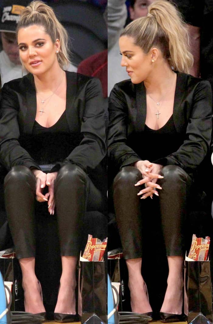 Khloe showed her support for boyfriend Tristan Thompson, who plays for the Cavaliers. The 32-year-old reality star went head-to-toe black with a black jacket, black top, leather pants and patent leather pointy-toe pumps. She swept her hair up into a high ponytail, and she finished off her look with nude lips and layered necklaces.