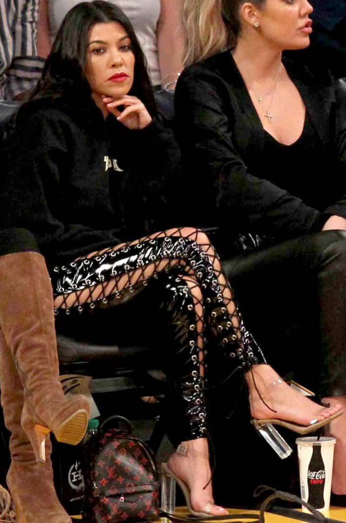 Meanwhile, Kourtney donned a black Yeezy hooded sweatshirt paired with black leather lace-up leggings. She completed her ensemble with a Louis Vuitton purse and Yeezy sandals, and kept her hair and makeup simple with straight black tresses and red lips.