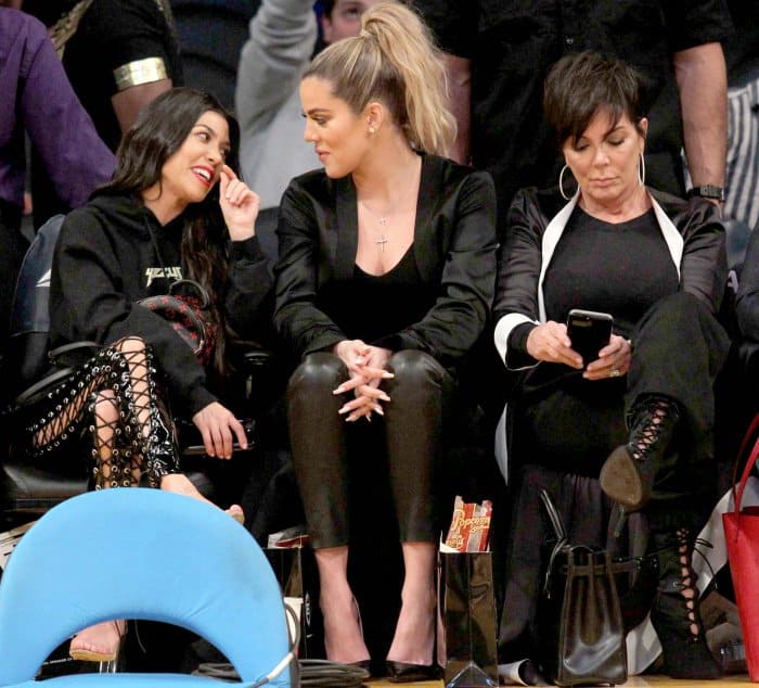 The sisters ditched the team colors and dressed up in black, chatting happily during the game while Kris fiddled with her phone. Kris wore a black duster coat with contrasting white trim over a black shirt and black pants, accessorizing with huge hoop earrings, a black leather handbag and lace-up booties.