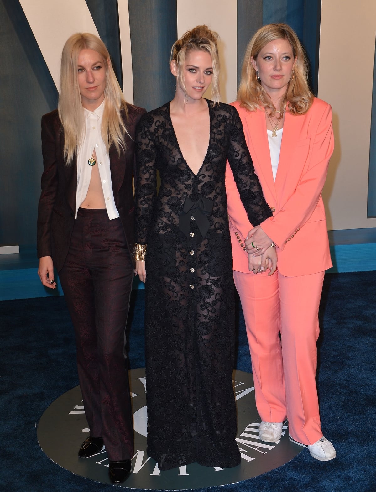 Kristen Stewart in a sheer Chanel gown with Dylan Meyer and a friend at the 2022 Vanity Fair Oscar PartyKristen Stewart in a sheer Chanel gown with Dylan Meyer and a friend at the 2022 Vanity Fair Oscar Party hosted by Radhika Jones at Wallis Annenberg Center for the Performing Arts on March 27, 2022, in Beverly Hills, California (Credit: MEGA / WENN / Jen Lowery)