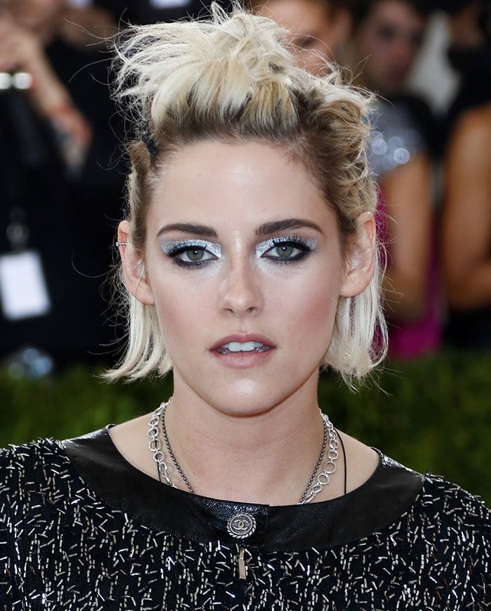 Kristen Stewart shows off her bleached hair and dark roots at the “Manus x Machina: Fashion In An Age Of Technology” Costume Institute Gala held May 2, 2016, at the Metropolitan Museum of Art in New York City (Credit: WENN)