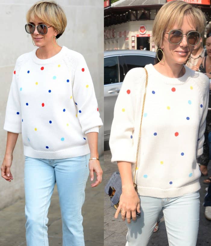 The 43-year-old actress and writer wore a Resort 2017 white chunky knit sweater with colorful polka dots.
