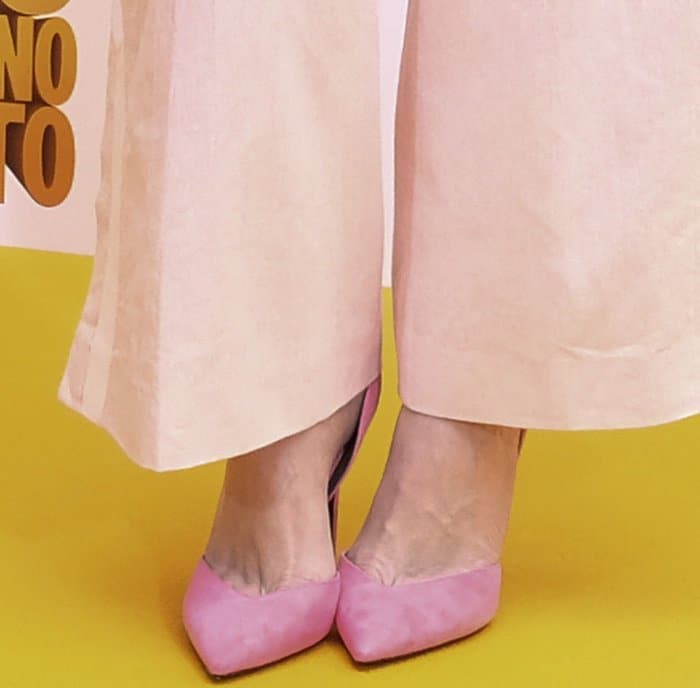 Kristen’s Stella Luna shoes in a complementary pink hue added a feminine touch to her menswear-inspired look. This suede style features pointy toes, V-shaped vamps, and leather lining and soles.