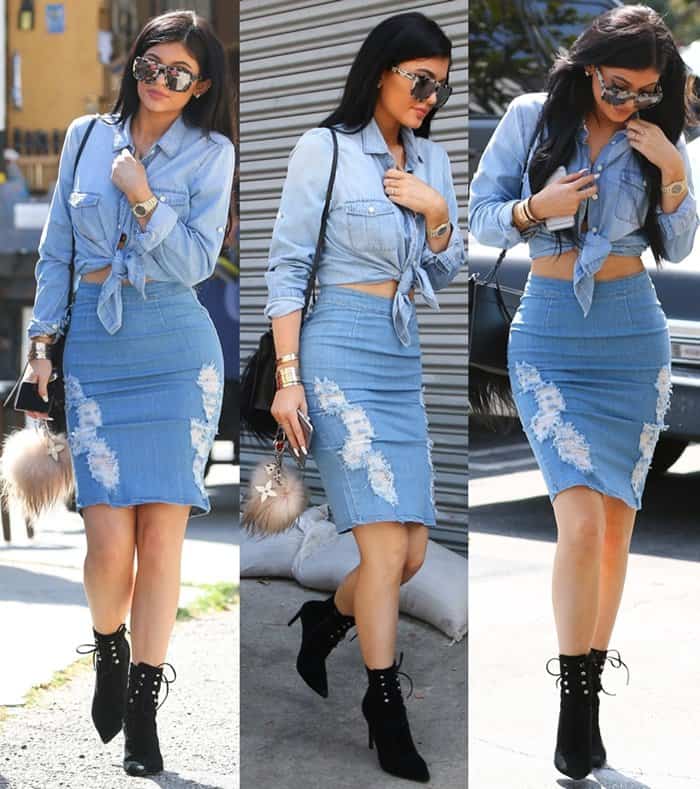 Kylie was spotted wearing the same look and Fame Denim skirt while shopping at Fred Segal a few months ago. She made the outfit a little edgier with pointed lace-up booties.