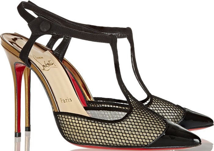 These leather-trimmed t-strap pumps feature nude fishnet with tonal sheer mesh lining and 4.7-inch covered heels.