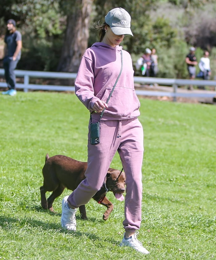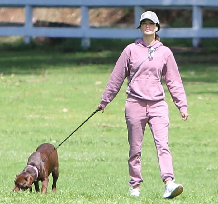 In March 2020, wearing a soft pink sweatsuit, Alessandra Ambrosio took her chocolate Labrador pup Cinnamon for a stroll in the Pacific Palisades.