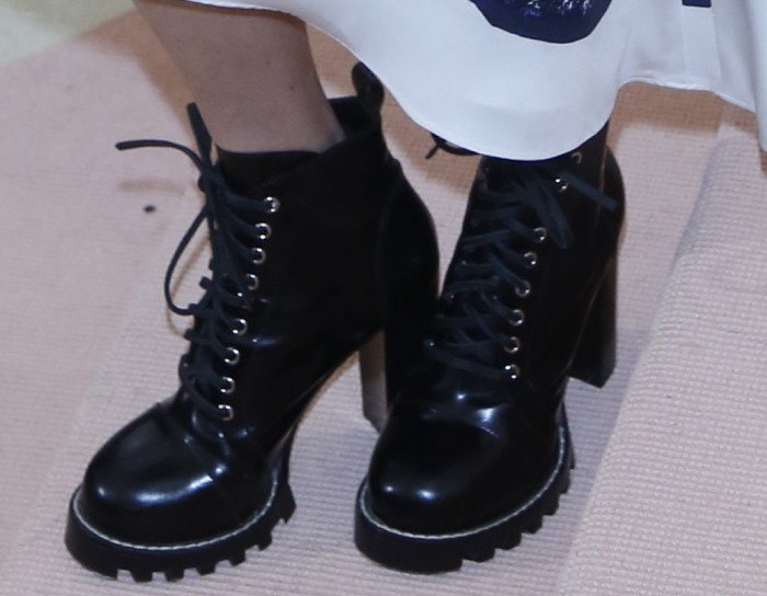 To finish the look, Connelly added a surprising twist—chunky, lug-soled black combat boots straight from Louis Vuitton’s runway, a bold choice that contrasted sharply with the gown’s ornate floral design.