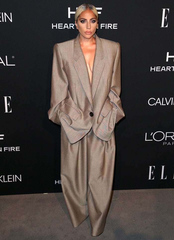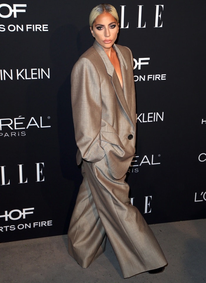 For ELLE’s 25th annual Women in Hollywood celebration, Lady Gaga donned an oversized suit from the Marc Jacobs Spring 2019 Collection. She completed her outfit with custom black leather platform lace-up booties from Giuseppe Zanotti.