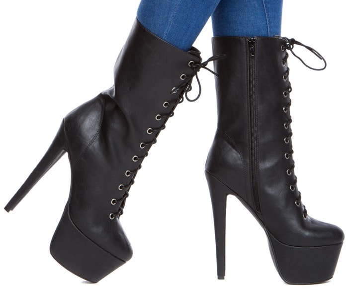 Not surprisingly, Lady Gaga turned plenty of heads as she flaunted her cleavage in this low-cut dress featuring a slit to the upper thigh. While we have not been able to identify her lace-up boots, here’s a reasonable alternative from ShoeDazzle that we hope you’ll like:
