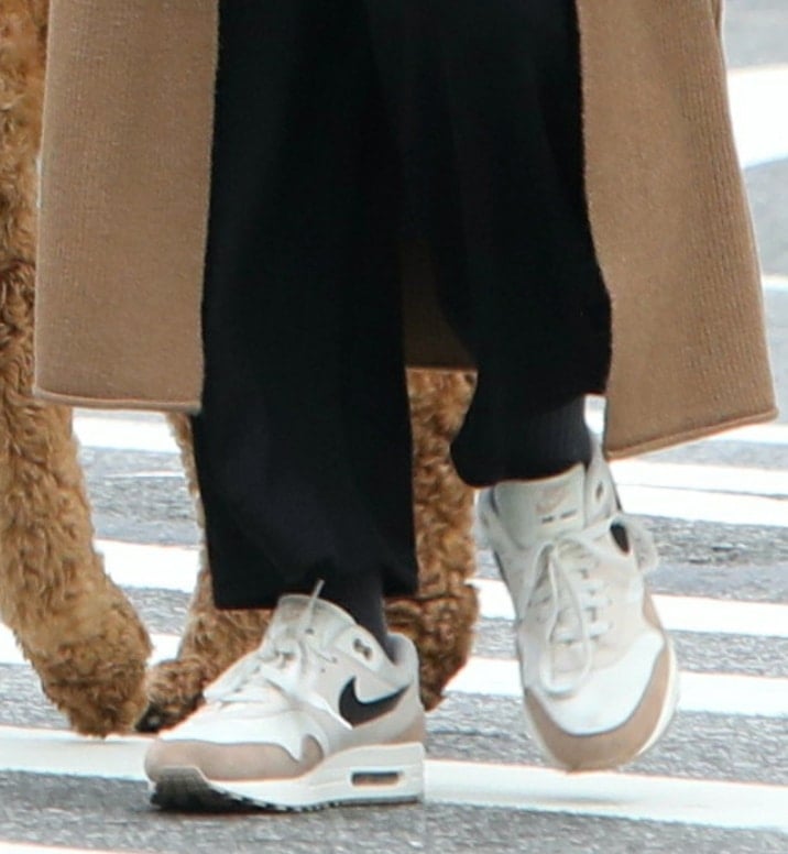 She teamed her casual cold-weather look with black flared yoga pants and a pair of Nike Air Max 1 shoes in desert sand colorway.