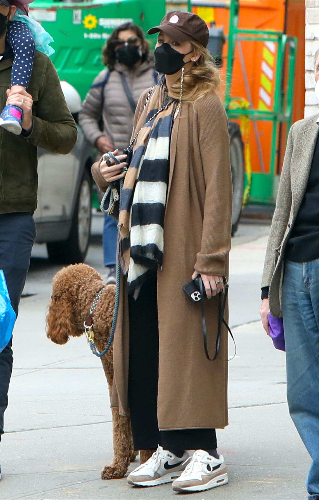 Holding their family dog’s leash in one hand, the mom-of-three styled her blonde hair in a loose wavy ponytail and wore barely-there makeup.