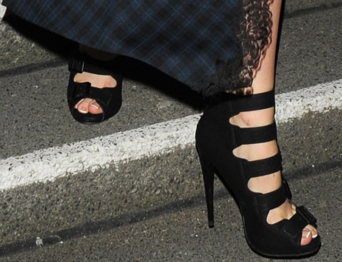 - Outfit: Ruched black mesh Christopher Kane dress with platform Kurt Geiger heels that showcased her foot tattoo.