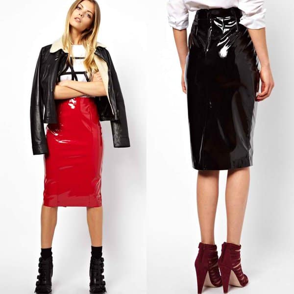 The vinyl skirt is made from PVC, a synthetic material mimicking genuine leather. It has a pencil silhouette, which makes it the perfect candidate for pairing with crop tops. Its shiny finish and bright red color make it a pretty closet item to pair with neutral pieces.