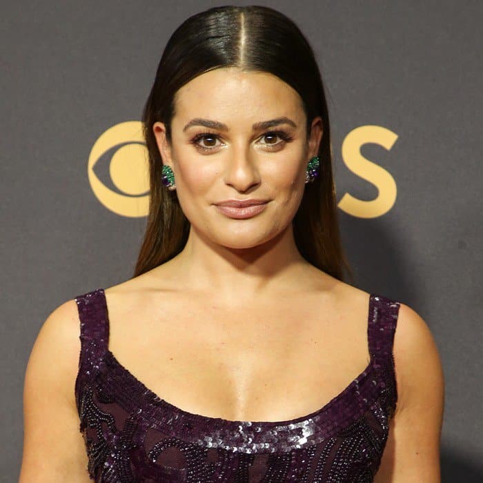 Lea Michele accentuated the look with a coordinating plum belt, though it subtly blended into the gown’s dazzling fabric
