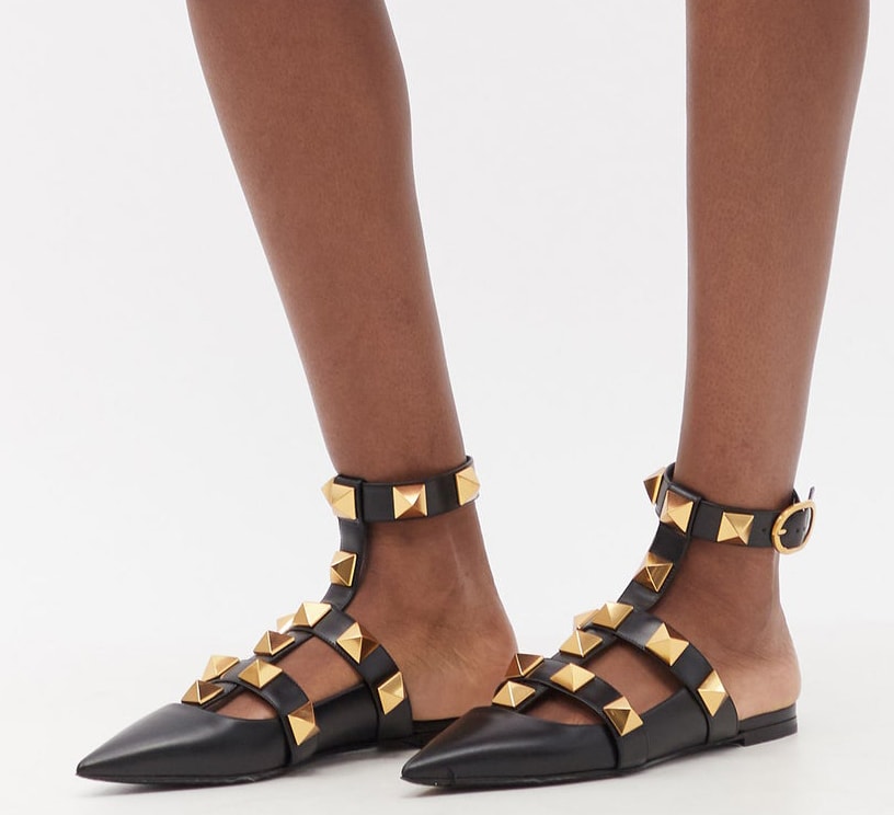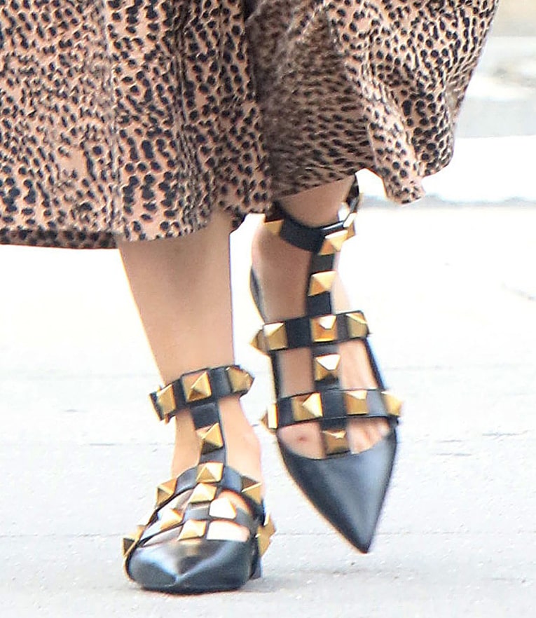 Completing her glammed-up afternoon stroll look were Valentino Garavani’s Roman Stud pointed-toe backless flats.