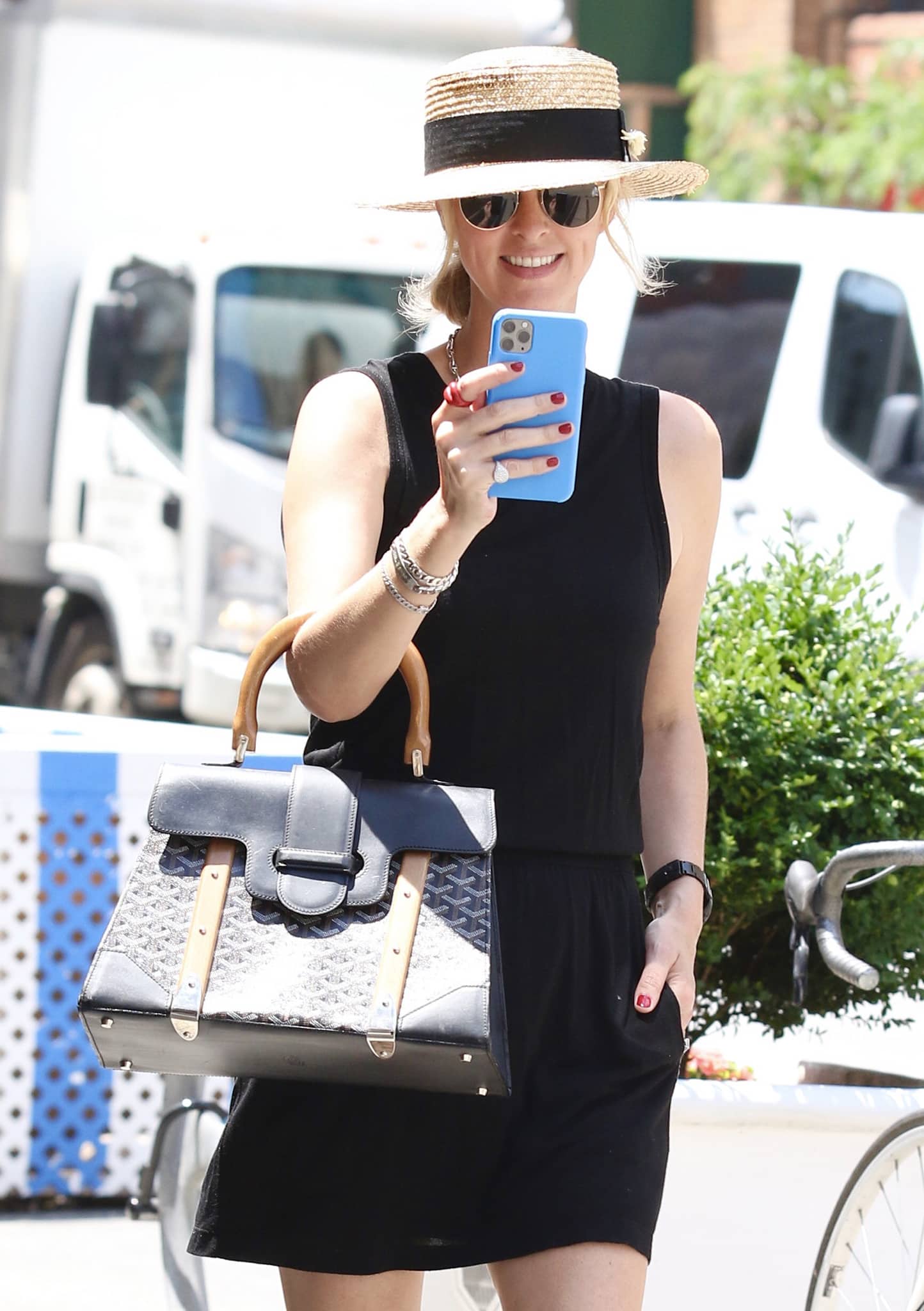 Keeping the look summery, James Rothschild’s wife hid her tresses underneath a straw hat with black ribbon trim. She also wore a pair of Ray-Ban rounded sunnies and carried her essentials in a Goyard Saigon bag.