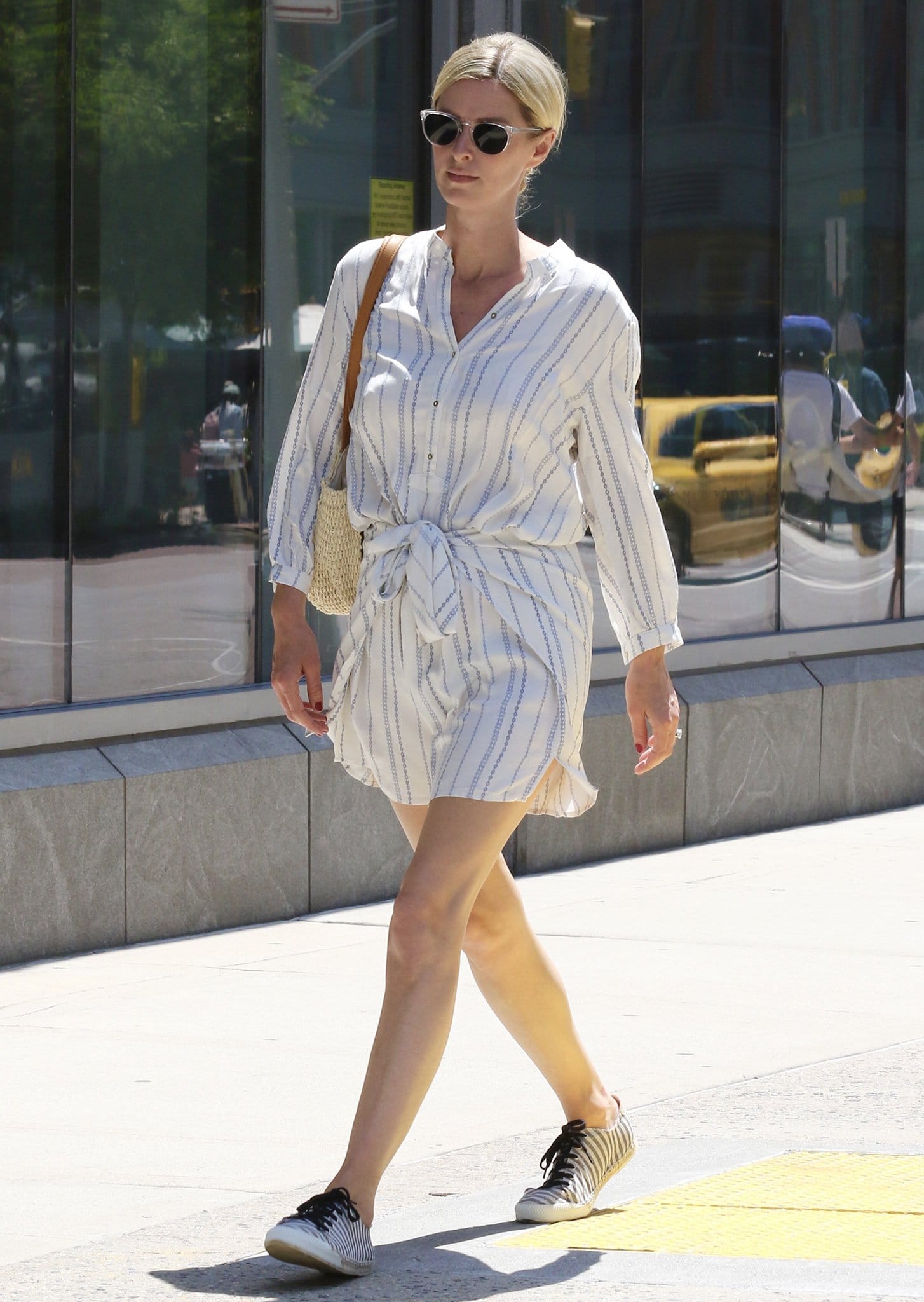 Embracing the season’s summer stripes, the hotel heiress ran errands in a white striped romper that showcased her slender legs. It has long sleeves, a button-up front, and a tie around the waist.