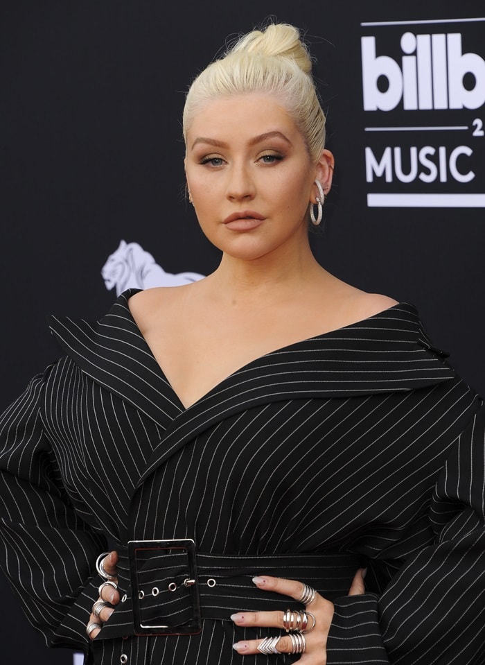 Christina Aguilera’s jacket dress features a belted waist and a side train