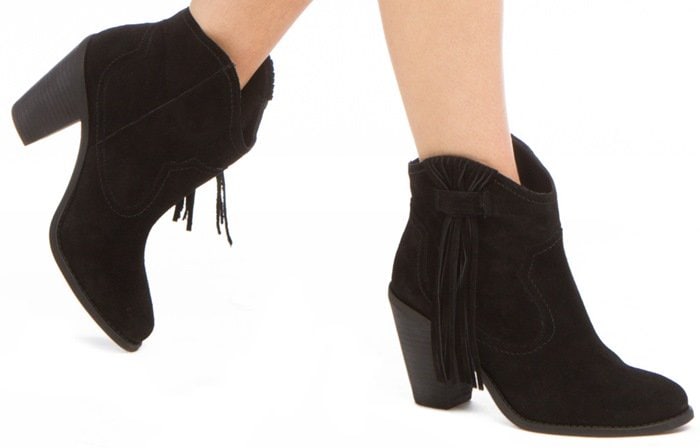 Lush fringe lends Western-inspired appeal to a suede bootie featuring tonal stitching and a sturdy stacked heel.