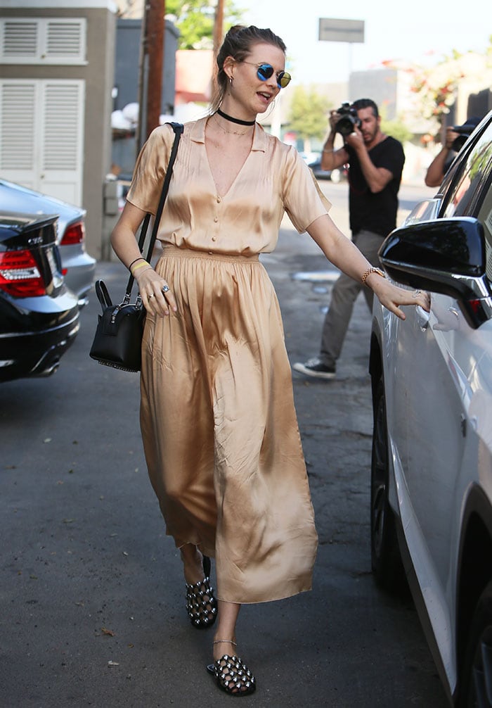 The then 26-year-old ditched the high heels and teamed the silky frock with a comfy pair of slides.