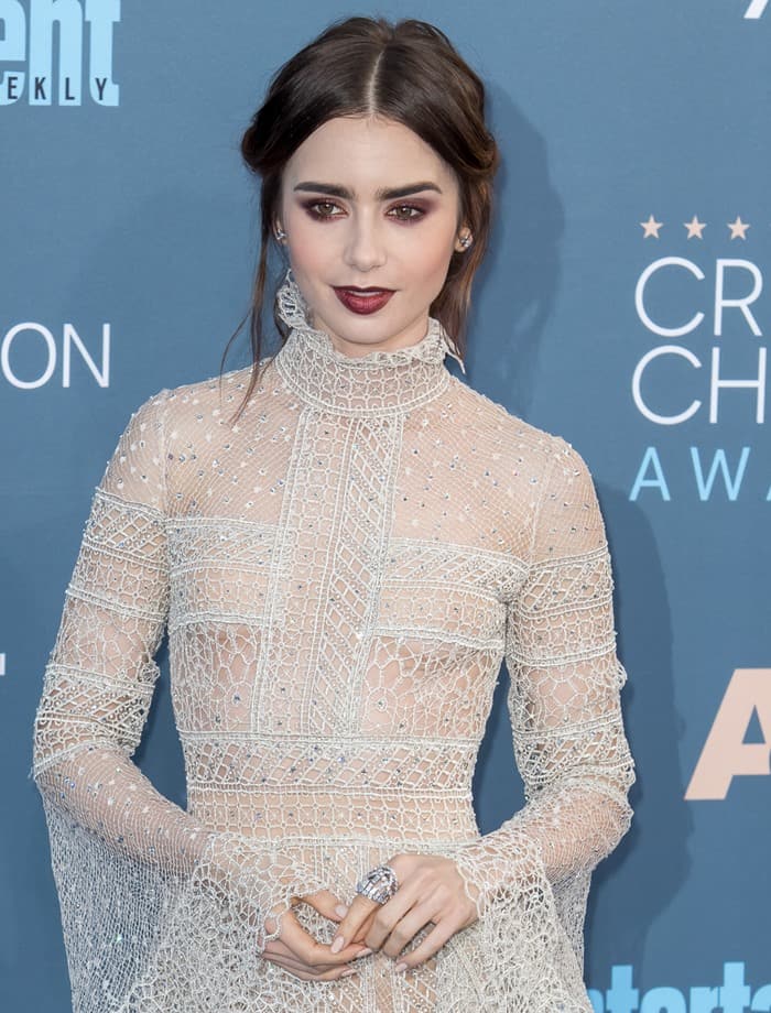 Gothic-Glam Lily Collins wearing a lacy sheer dress featuring billowy sleeves with embroidered crystals at the 22nd Annual Critics’ Choice AwardsGothic-Glam Lily Collins wearing a lacy sheer dress featuring billowy sleeves with embroidered crystals at the 22nd Annual Critics’ Choice Awards at Barker Hangar in Santa Monica on December 11, 2016 (Credit: Michael Boardman / WENN)
