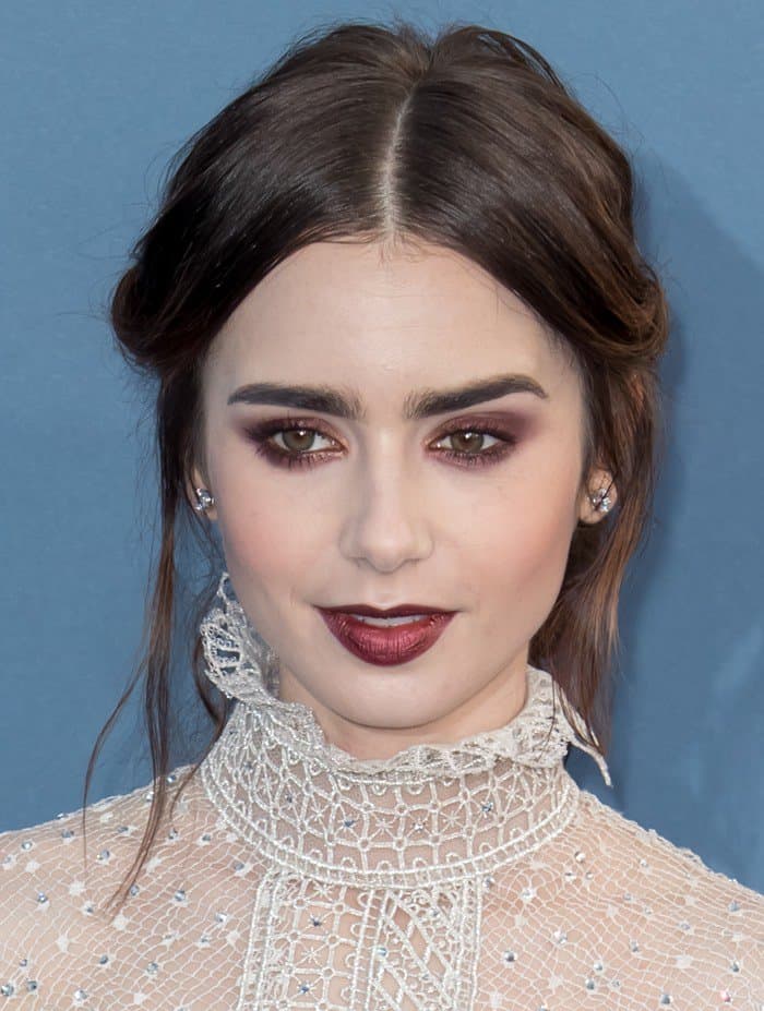 Lily Collins stuns with a bold, vampy makeup look featuring deep plum lips and smoky eye shadowLily Collins stuns with a bold, vampy makeup look featuring deep plum lips and smoky eye shadow