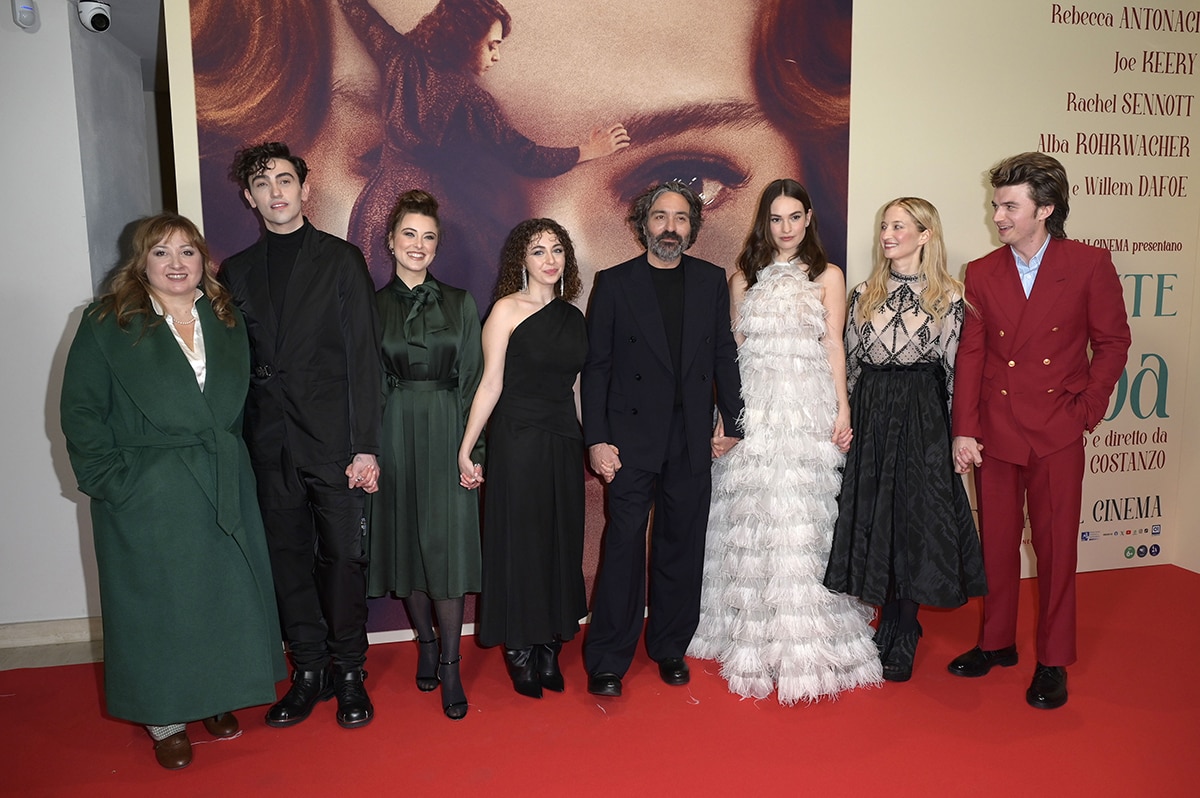 Lily James was joined on the red carpet by her co-stars, including Carmen Pommella, Michele Bravi, Sofia Panizzi, Rebecca Antonaci, director Saverio Costanzo, Alba Rohrwacher, and Joe Keery. Still, she stole the show in her ethereal ensemble.