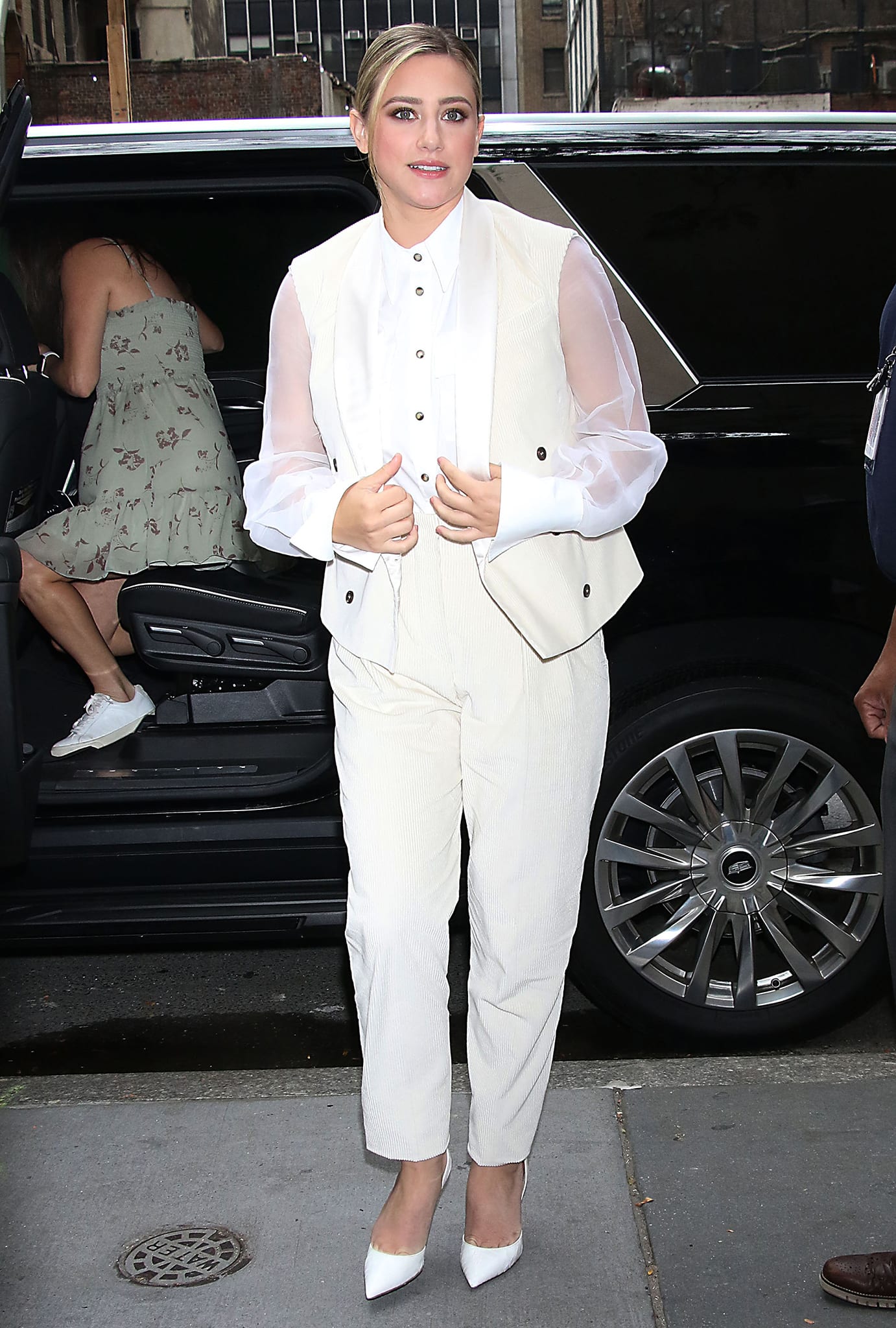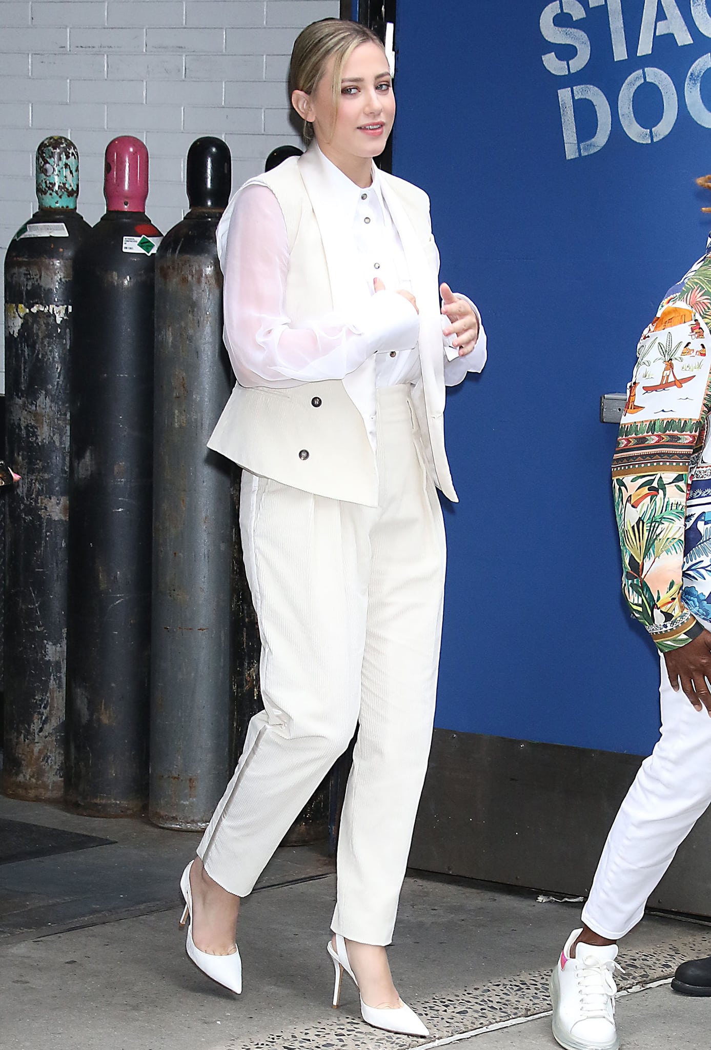 Chic Androgyny: Lili Reinhart in a White Tuxedo Suit and Slingback Pumps