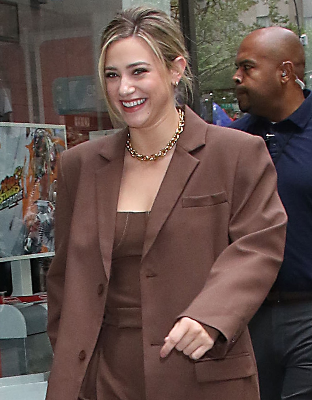 The Hustlers star later visited the Today Show to talk about her new flick. Heading to the studios, Lili traded her white tuxedo suit for a sleek chocolate-brown suit from the Australian womenswear brand Sir The Label.
