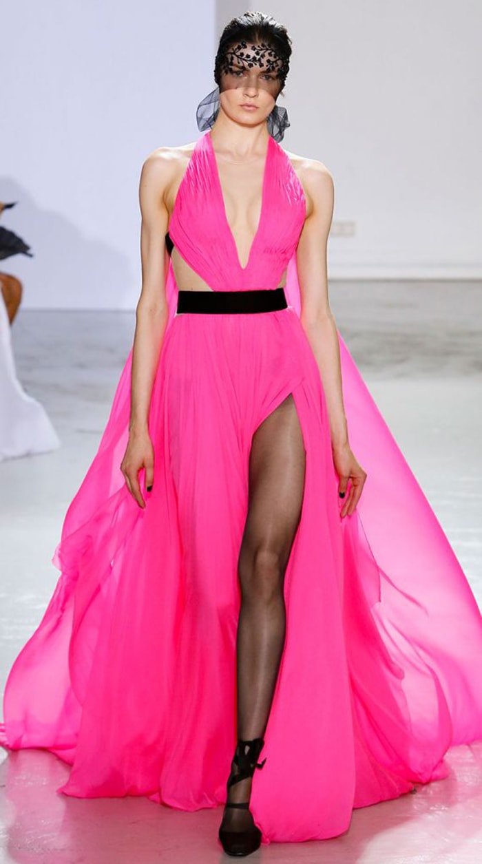 It’s a pink silk chiffon halter-neck dress with a plunging neckline, side cutouts, a thigh-high slit, and contrasting black velvet detailing.