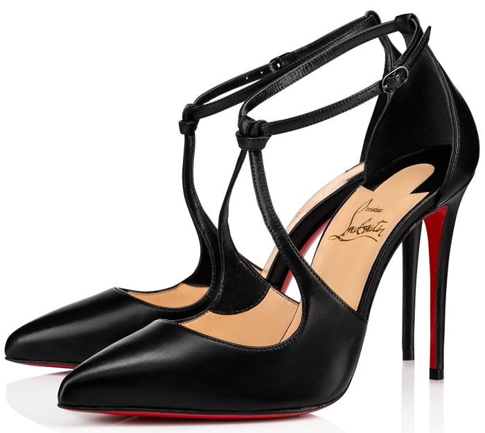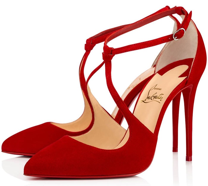 Those looped knots at the ankle straps and, of course, the red soles identify Gwendoline’s shoes as the Christian Louboutin ‘Alminetta’ pumps.