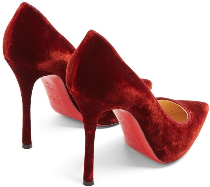 Christian Louboutin’s burgundy velvet ‘Decoltish’ pumps from the Fall/Winter 2017 collection are crafted in Italy with a sharp pointy toe and sultry curved high stiletto heel.