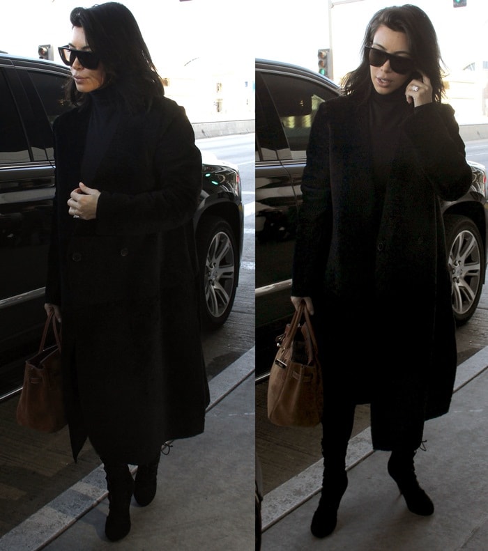 Kim Kardashian sported a chic black outfit while catching a flight out of LAX Airport on Tuesday in Los Angeles.
