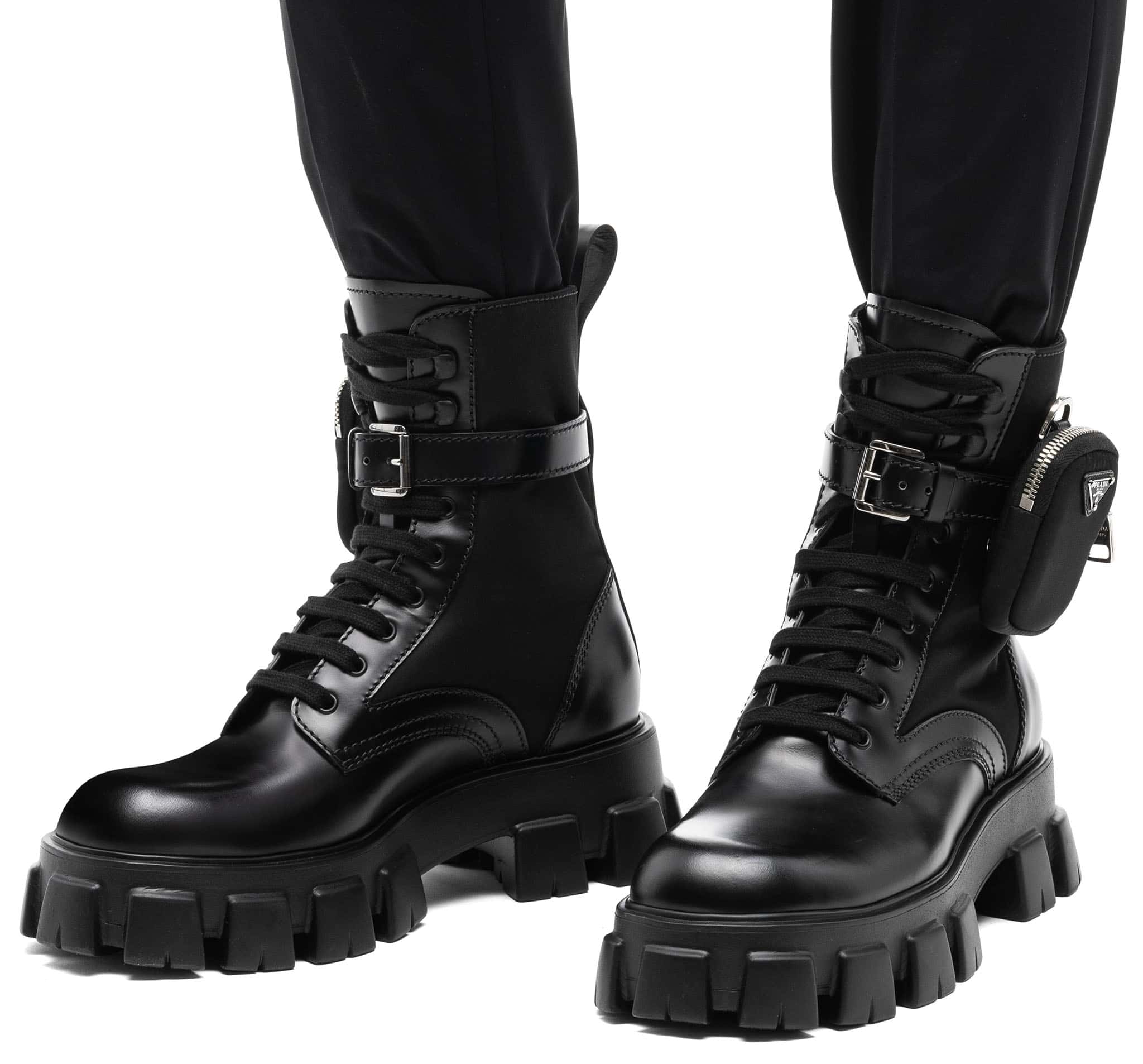 The Prada brushed leather and technical fabric boots are characterized by the removable pouch and have oversized light rubber sawtooth solesThe Prada brushed leather and technical fabric boots are characterized by the removable pouch and have oversized light rubber sawtooth soles