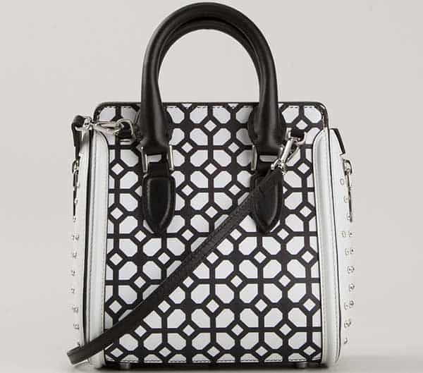 Lupita’s Alexander McQueen tote features the same black-and-white geometric pattern as her dress.