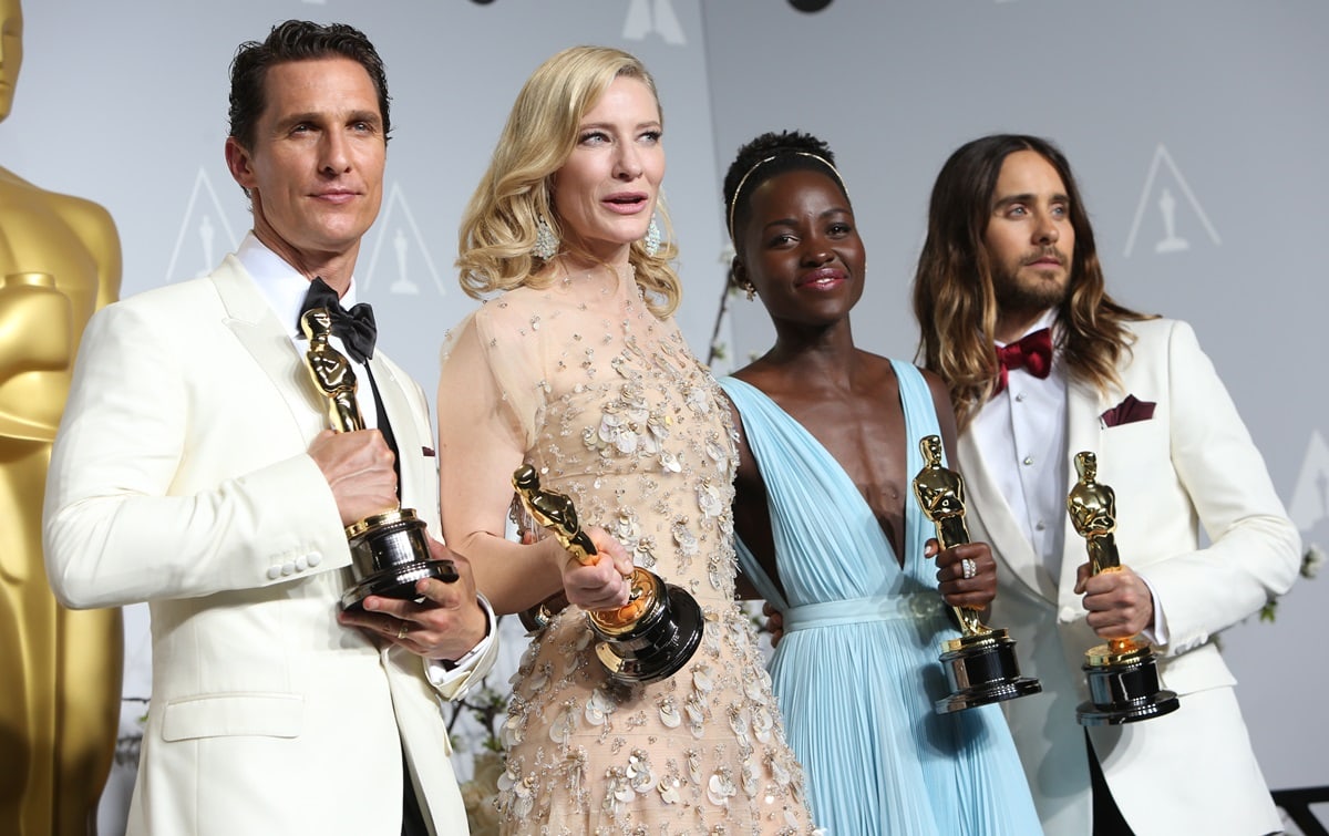 At the 86th Academy Awards ceremony held on March 2, 2014, at the Dolby Theatre in Hollywood, Los Angeles, McConaughey won the award for Best Actor for his role in “Dallas Buyers Club,” Blanchett won the award for Best Actress for her role in “Blue Jasmine,” Nyong’o won the award for Best Supporting Actress for her role in “12 Years a Slave”, and Leto won the award for Best Supporting Actor for his role in “Dallas Buyers Club” (Credit: Kathy Hutchins / Shutterstock)