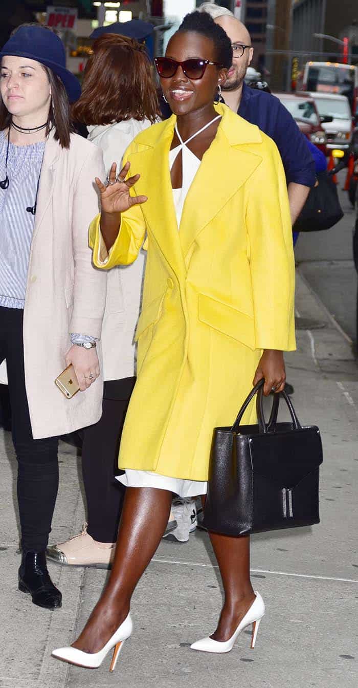 Lupita Nyong'o's zesty, lemonade-yellow Escada coat was no exception to her great sense of style, as seen outside the studios of The Late Show with Stephen Colbert in New York CityLupita Nyong’o’s zesty, lemonade-yellow Escada coat was no exception to her great sense of style, as seen outside the studios of The Late Show with Stephen Colbert in New York City on September 28, 2016 (Credit: Darla Khazei / WENN)