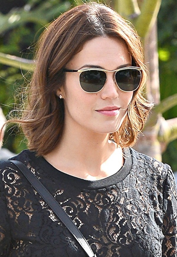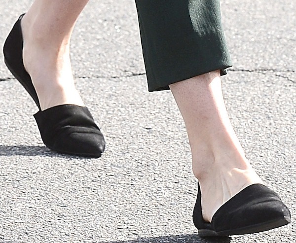 She looked chic and comfortable in an effortlessly cool ensemble with a black lace top, green trousers, dark sunglasses, and black suede flats from Jenni Kayne.