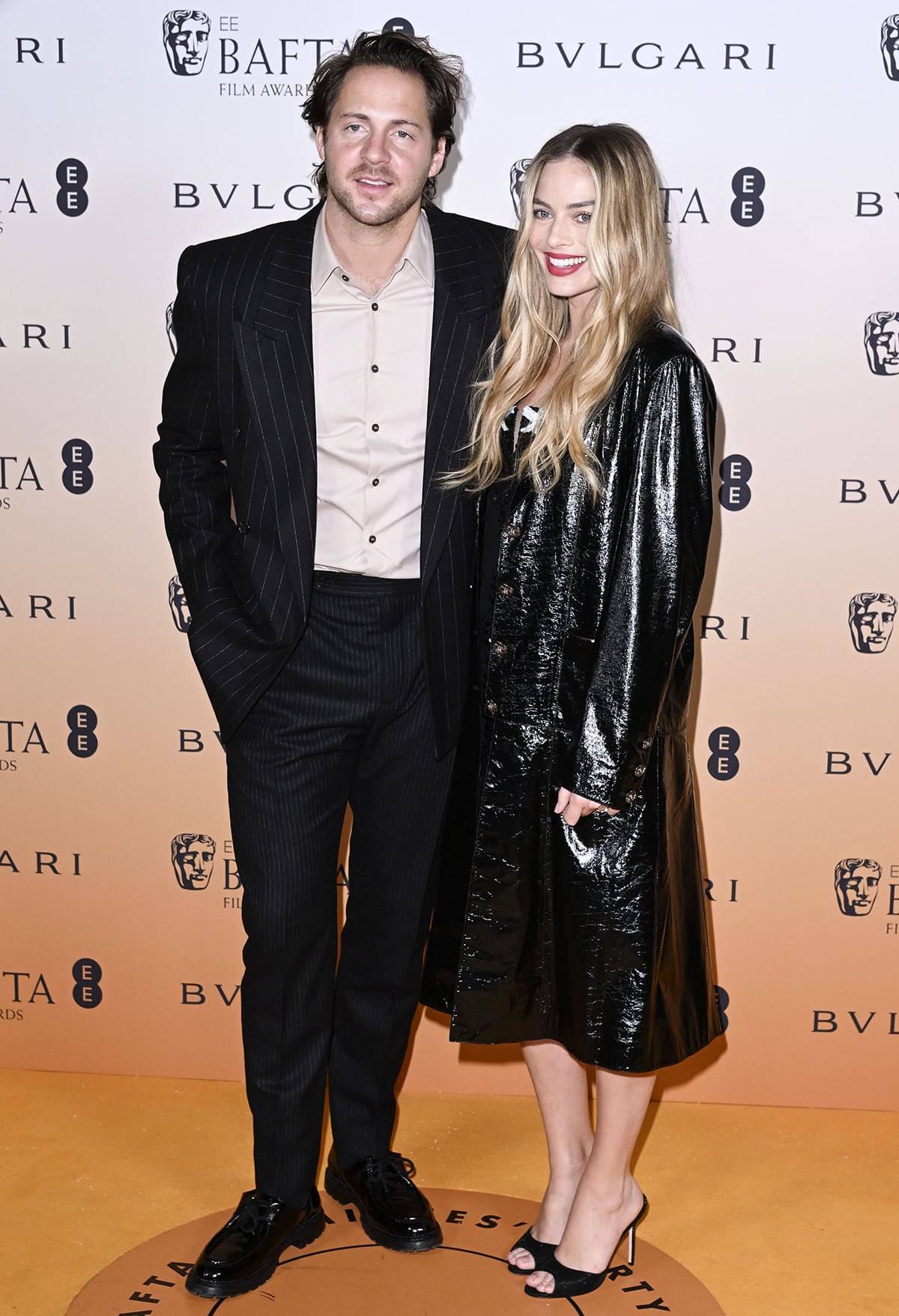 Margot was accompanied by her husband, Tom Ackerley, who looked sharp in a beige shirt tucked into a pair of pinstripe pants and worn beneath a black pinstripe jacket. He accessorized his ensemble with chunky oxford shoes.